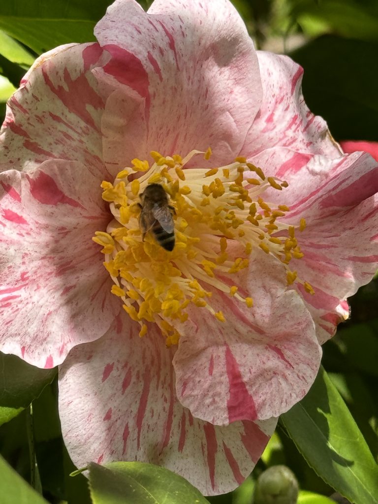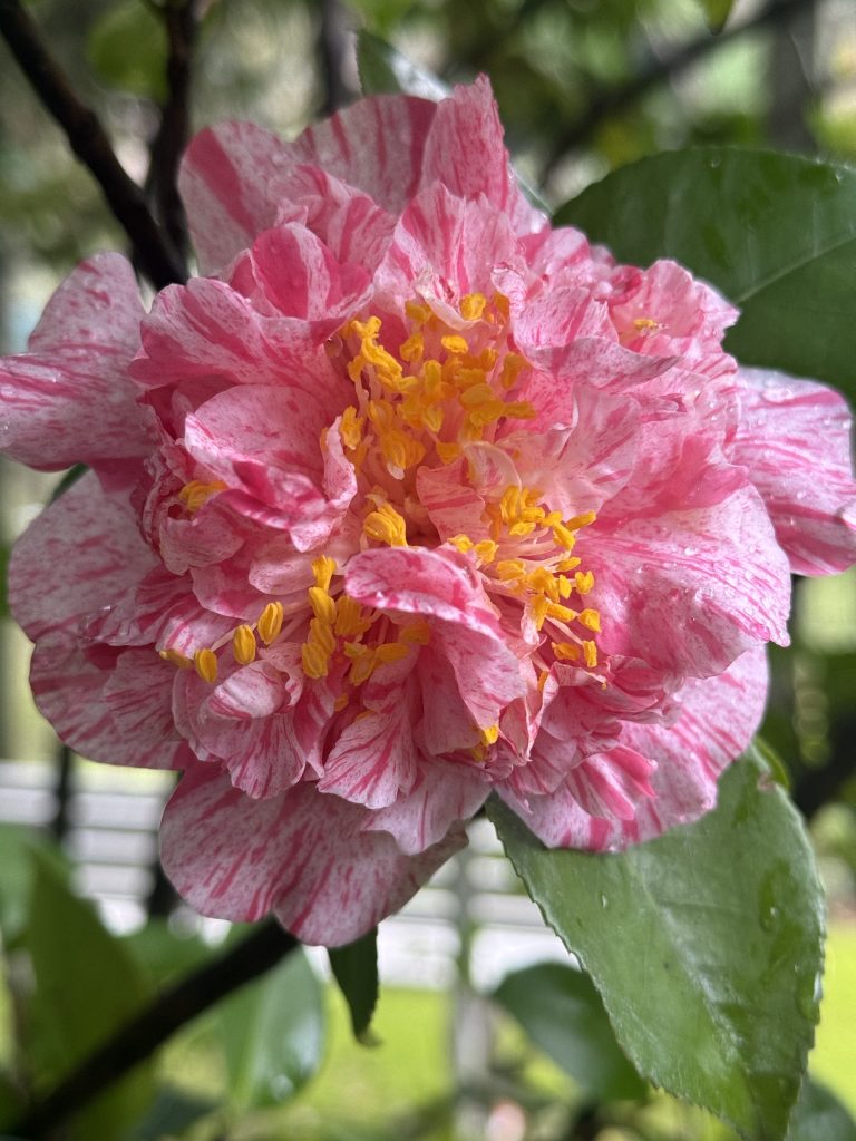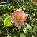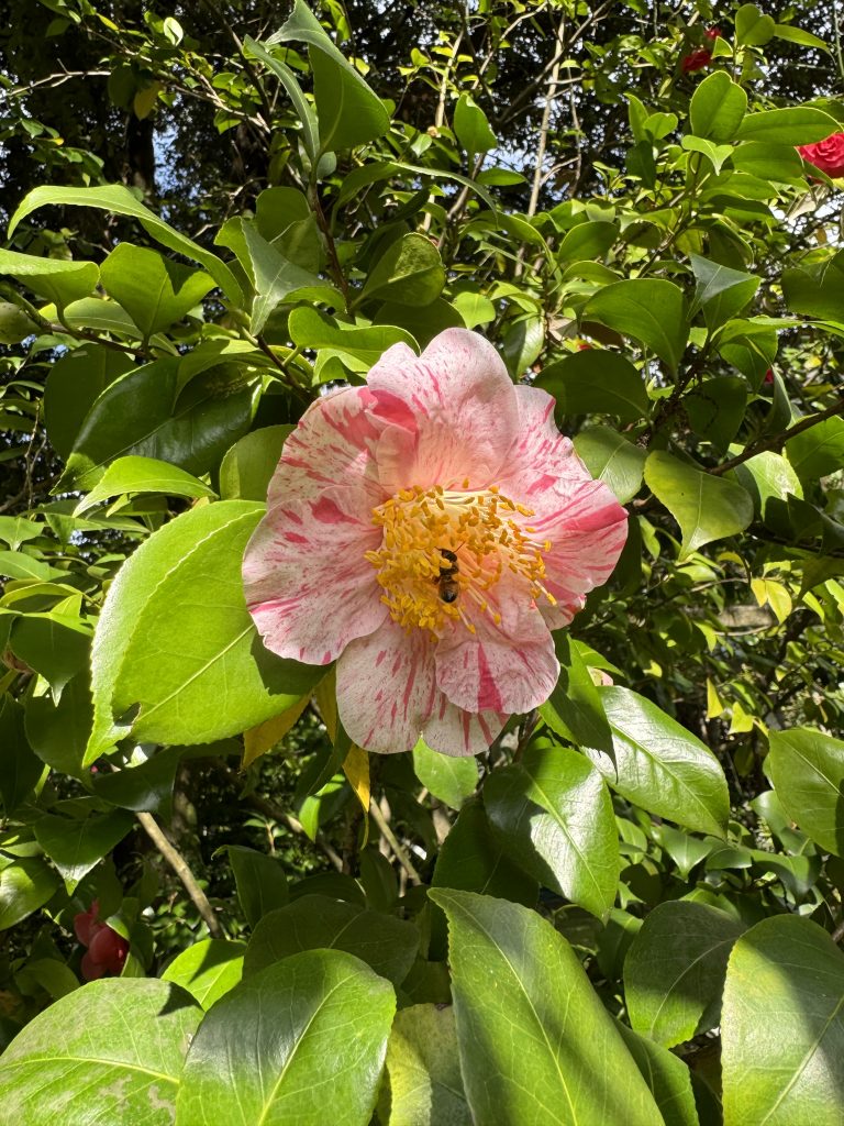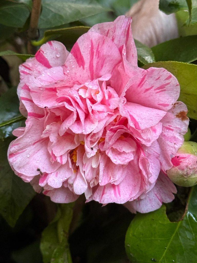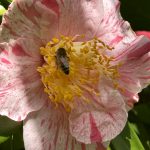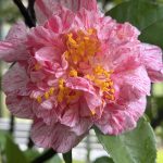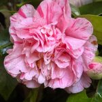 Fiore medio grande , semidoppio, peoniforme , irregolare, bianco-roseo screziato e spruzzato di rosa intenso.(RHS red group 52 A e 52 B).Cultivar dotato di leggera fragranza (F).