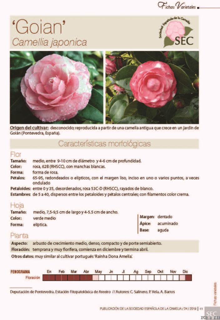 Goián . ( C. japonica ). Pubblicato in PUBLICACIÓN DE LA SOCIEDAD ESPAÑOLA DE LA CAMELIA . 2019. 34(41) e poi in inglese su International Camellia Journal , 2020, 52: 122 con una foto a colori . Origine: Estación Fitopatolóxica Areeiro. È stata riprodotta da una pianta antica che è stata coltivata in un giardino a Goián, Pontevedra (Galizia, Spagna). FIORE Dimensioni: medie, 9-10 cm di diametro e 4-6 cm di profondità; Colore: rosa, 62B (tabella colori RHS), maculato bianco; Forma: a rosa; Petali: 65-95, arrotondati o ellittici, con margine liscio, dentellato o variamente dentellato o ondulato; Petaloidi: 0-35 disordinati, rosa 53C-D (tabella colori RHS) striati di bianco; Stami: 5-40, dispersi tra petaloidi e petali interni; filamenti color crema. FOGLIA Dimensioni: medie, 7,5-9,5 cm di lunghezza e 4-5,5 cm di larghezza; Colore: verde medio; Forma: ellittica; Margine: dentato; Apice: acuminato; Base: acuta. PIANTA Periodo di fioritura: precoce e molto fiorifera; inizia a dicembre e si estende fino ad aprile; Portamento: cespuglioso, denso, compatto e semiaperto; tasso di crescita medio.