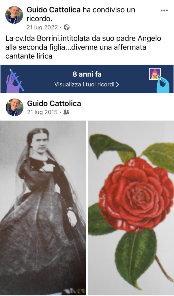 Leguay, gennaio 1853, Revue Horticole, p.30: Corallo scuro con macchie bianche; petali leggermente bordati di bianco. Doppio di medie dimensioni, imbricato. Antiche Camelie, 2003, Hillebrand / Bertolazzi: doppio medio irregolare, di colore rosso piuttosto intenso, talvolta con segni bianchi sui petali esterni. Foglie medie, ellittiche, acuminate. Antiche camelie della Lucchesia, 2012, Scuola superiore Sant’Anna. Originata nel 1837 da Borrini, Firenze, Italia.