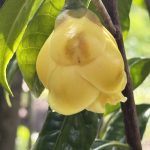 Gao Jiyin, Clifford R. Parks, Du Yueqiang, 2005, Specie raccolte del genere Camellia: un profilo illustrato, p.105. I fiori sono di colore giallo dorato, privi di patina cerosa, con un diametro di 5,5-7,0 cm, di solito portati all’estremità dei germogli e nelle ascelle delle foglie. Pedicelli lunghi 1,0-1,3 cm, curvati verso il basso, glabri. Brattee 4-6, glabre. Sepali 5-6, glabri. Petali 12-15, lunghi 1,5-4,0 cm, larghi 1,5-3,0 cm, di forma ampiamente ovata o ovale-ellittica, molto sottili, glabri, fusi dalla base con gli stami per formare un tubo lungo 1,5 cm. Androceo glabro, lungo 1,3-2,5 cm, i filamenti più esterni fusi alla base in una colonna, stami in numero di 138-146. Gineceo glabro, lungo 1,0-1,5 cm, 3 stili, liberi, non fusi alla base. Stagione di fioritura: dalla fine dell’inverno alla primavera. Foglie lungo-ellittiche, apice caudato-acuminato, base largamente cuneata, lunghe da 8,0 a 18,5 cm, larghe da 2,5 a 7,0 cm, margine sottilmente seghettato, superficie superiore con vene leggermente incavate, glabra, superficie inferiore con nervatura centrale e vene laterali rialzate, glabra. Piccioli lunghi da 7 a 15 mm, glabri. Arbusto alto fino a 3 m, giovani germogli glabri, rami più vecchi di colore grigio-marrone, tronco liscio, corteccia di colore marrone-giallastro. Distribuzione: Foreste miste nella Contea di Pingguo, Guangxi; Altitudine: 250-450 m; Località specifica: Cantone di Pozao, Contea di Pingguo, Guangxi, Cina.