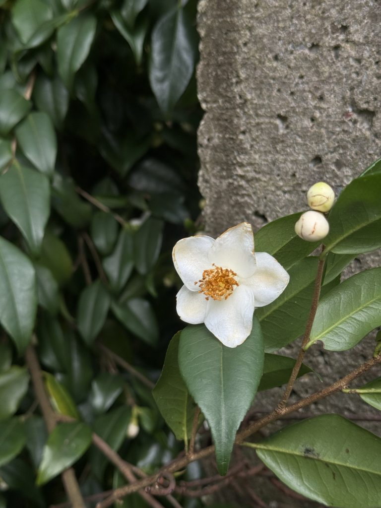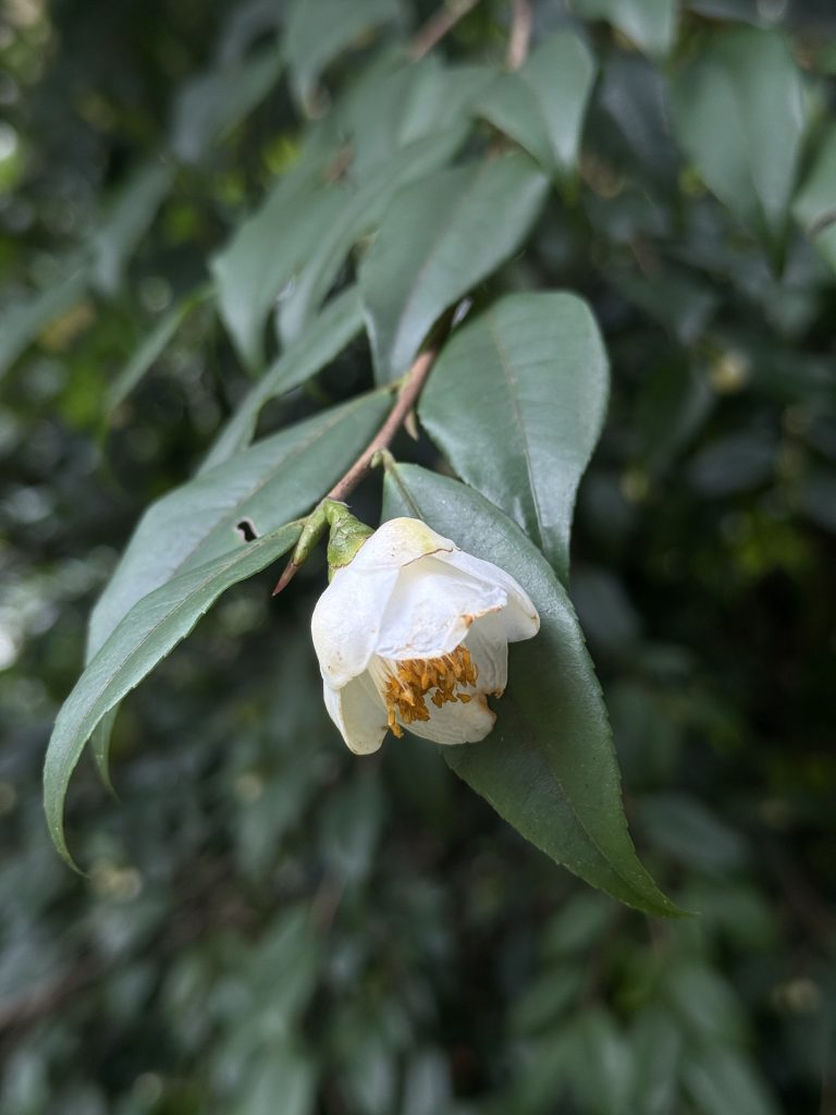 Gao Jiyin, Clifford R. Parks, Du Yueqiang, 2005, Collected Species of the Genus Camellia an Illustrated Outline, p.248. I fiori sono bianchi, profumati, di diametro 3,0-4,0 cm, portati all’estremità dei germogli. Pedicelli lunghi 4-5 mm, spessi. Brattee 5-6, glabre. Sepali 5, glabri, margine membranoso. Petali 6-8, lunghi 1,5-2,0 cm, ovati o rotondi, leggermente pubescenti sul retro, leggermente uniti alla colonna staminale dalla base. Androceo glabro, lungo circa 2 cm, i filamenti esterni sono per lo più fusi in un tubo. Gineceo lungo circa 1 cm, 3 stili, leggermente bifidi all’apice, ovario glabro. Stagione di fioritura: dall’inizio dell’inverno alla primavera. Capsule ovoidi, lunghe 2,5 cm, larghe 1,5 cm, 3 loculi, parete della capsula legnosa, spessa 1,5-2,0 mm. Foglie ellittiche, apice acuto o caudato, base ampiamente cuneata, lunghe 6,0-9,0 cm, larghe 2,0-3,0, metà superiore dei margini serrulati, superficie superiore con venature leggermente impressa, nervatura centrale puberulenta, superficie inferiore con venature rialzate, base della nervatura centrale pubescente. Piccioli lunghi 3-5 mm, pubescenti. Arbusto o piccolo albero alto fino a 3 m, germogli pubescenti, diventano glabri. Distribuzione: Sotto la volta della foresta nelle province di Sichuan e nell’ovest di Hunan; Elevazione: 500-1.700 m; Località specifica: Montagna Emei, provincia di Sichuan, Cina.
